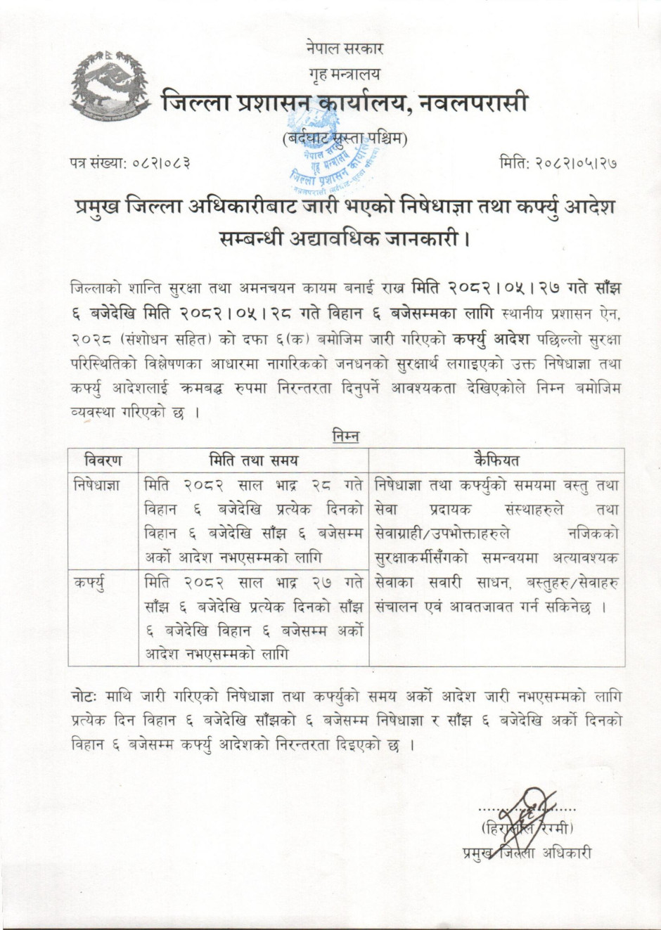 तस्बिर : प्रमुख जिल्ला अधिकारीबाट जारी भएको निषेधाज्ञा तथा कर्फ्यु आदेश सम्बन्धी अद्यावधिक जानकारी ।