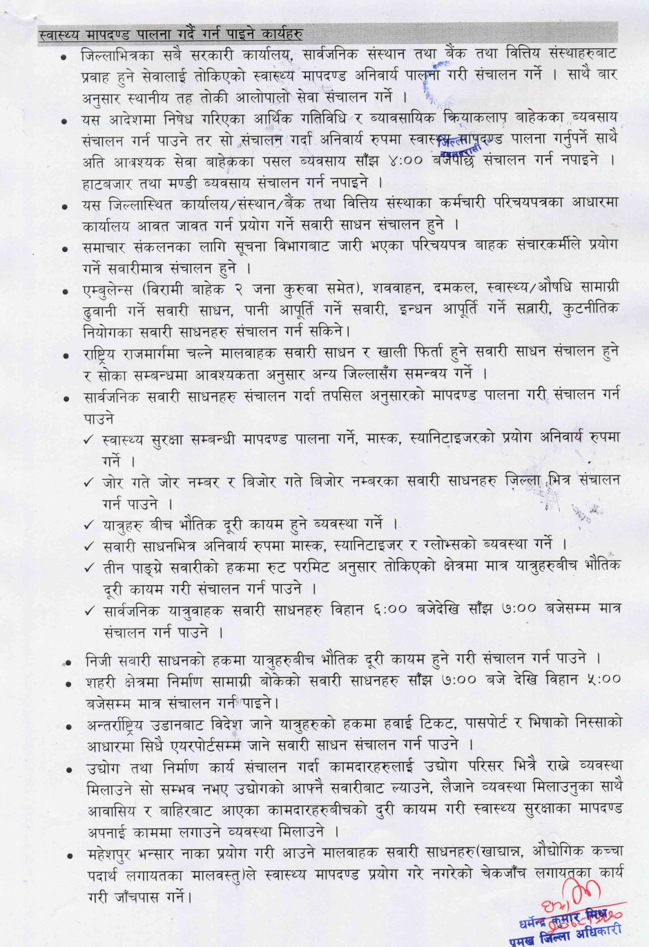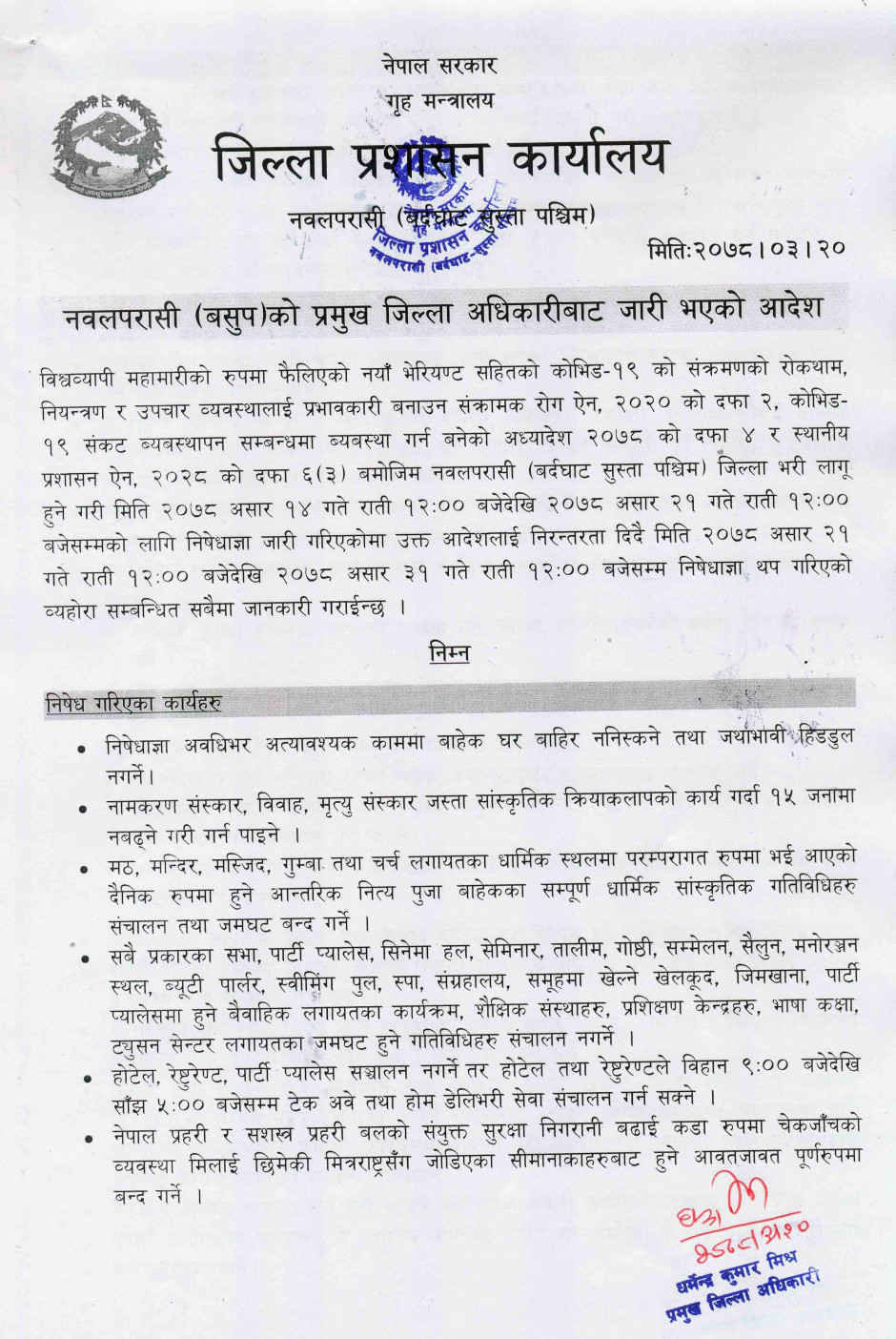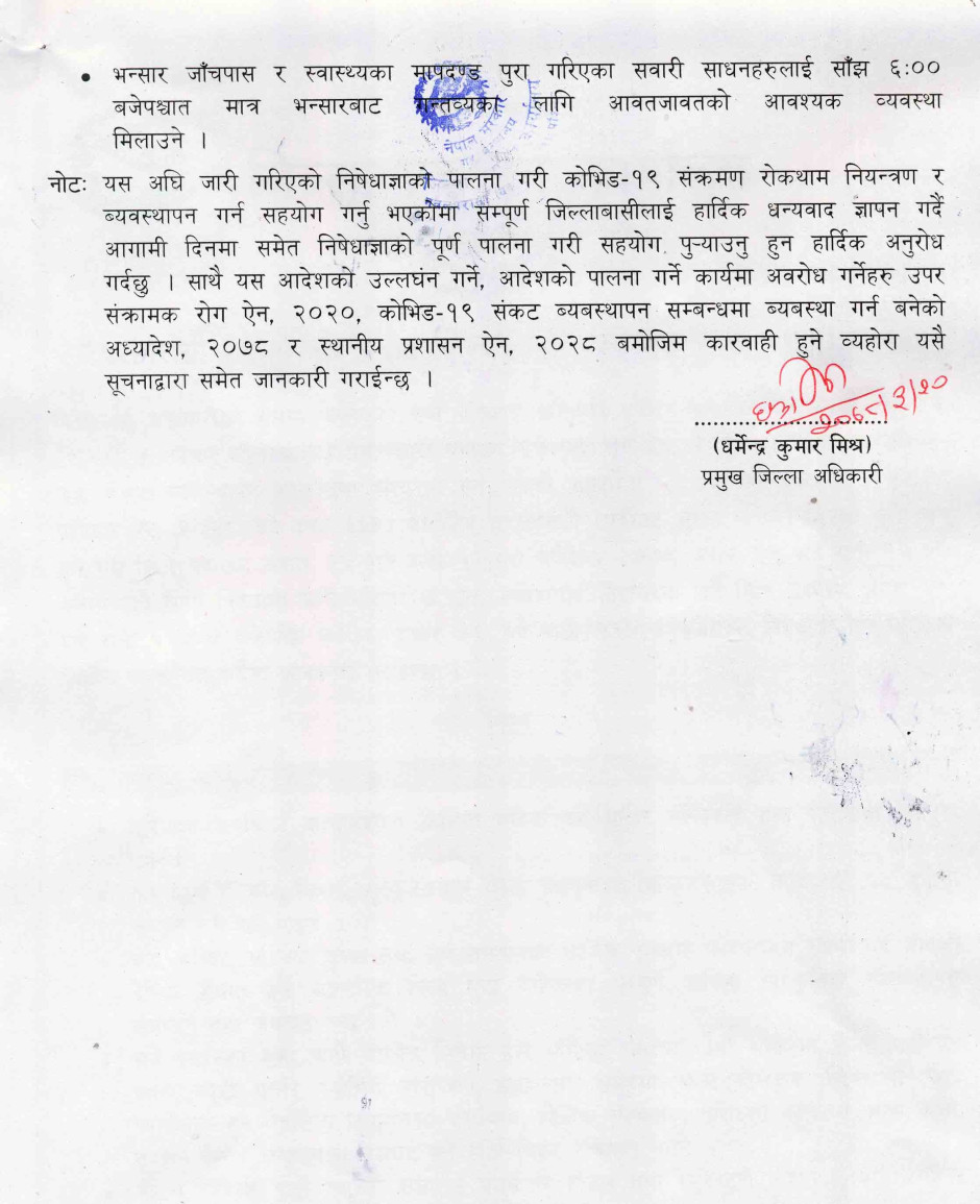 तस्बिर : प्रमुख जिल्ला अधिकारीबाट मिति २०७८।०३।२० गते जारी भएको निषेधाज्ञाको आदेश