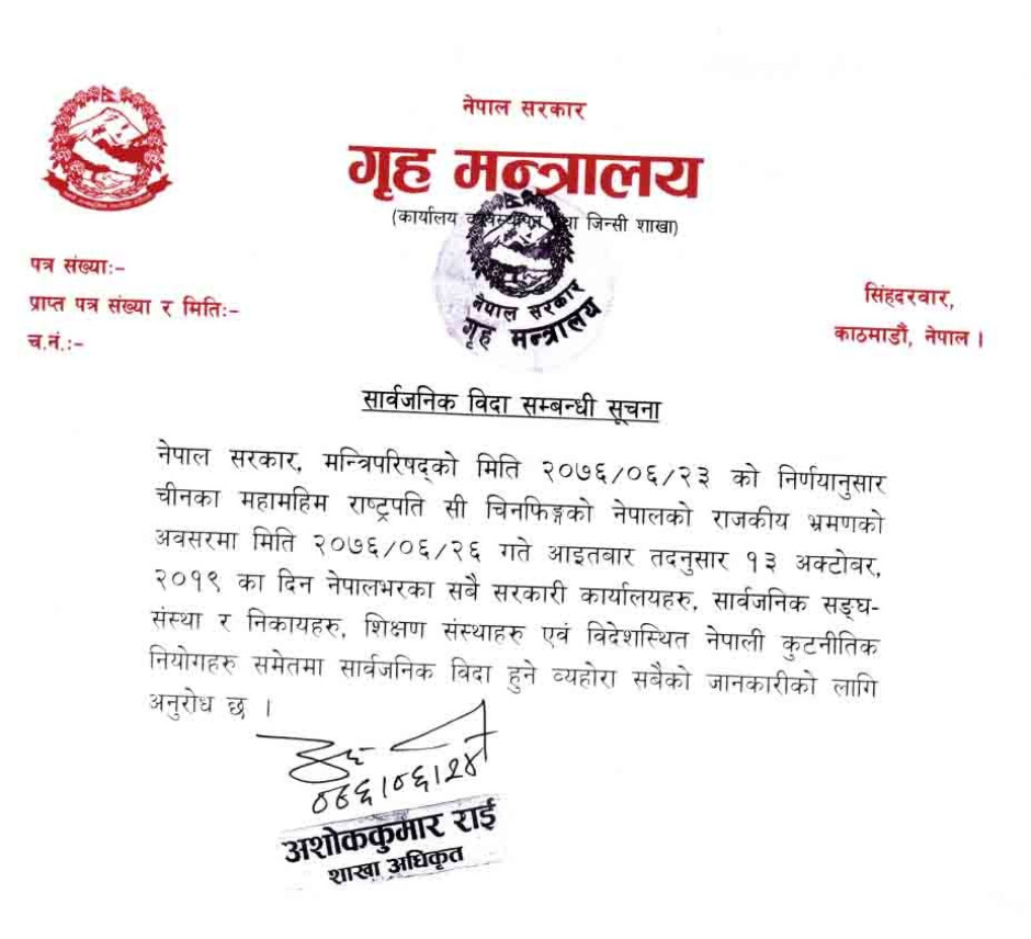 २०७६ साल असोज २६ गते सार्वजनिक विदा सम्बन्धमा ।