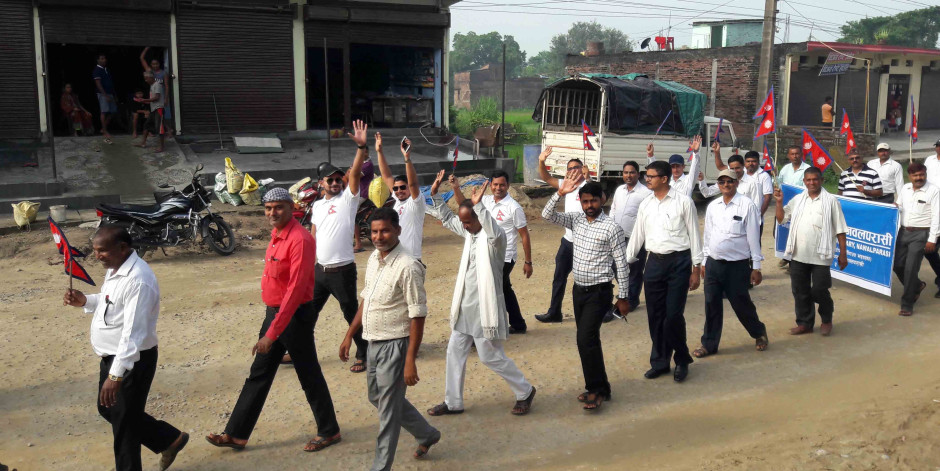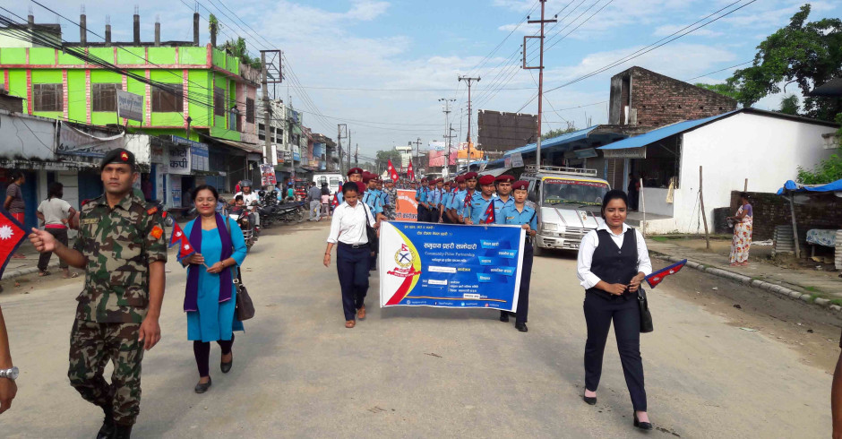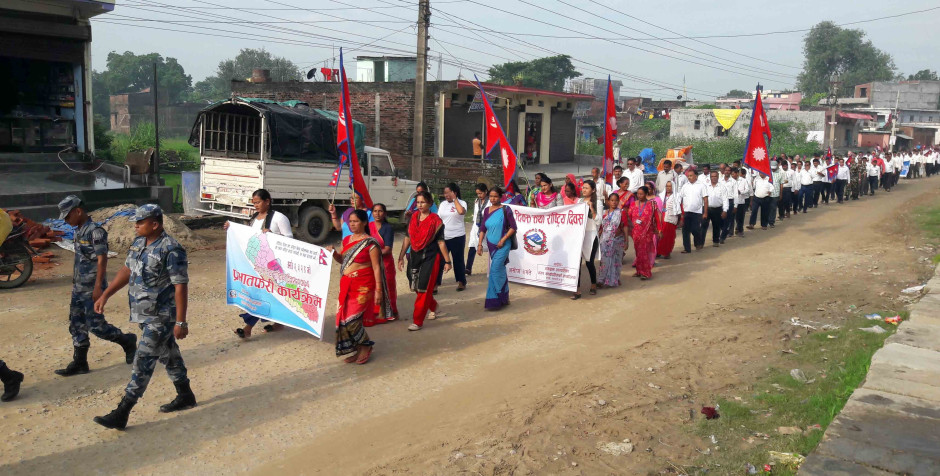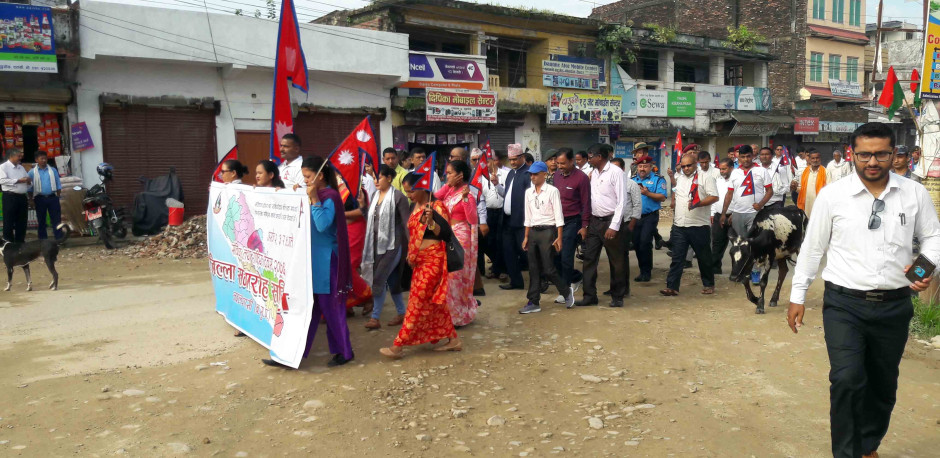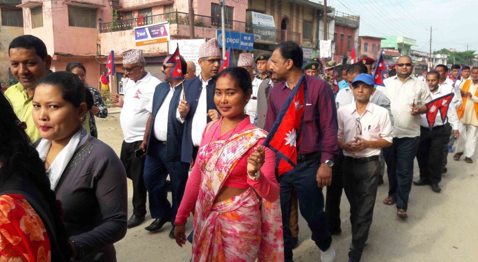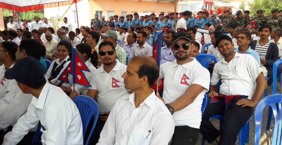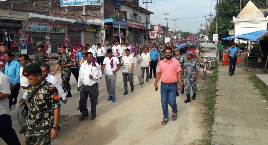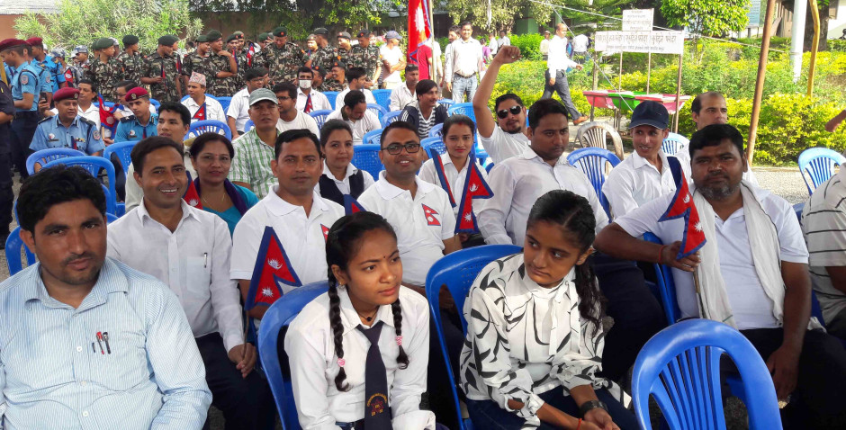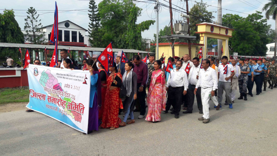 आज मिति २०७६ असोज ०३ गते संविधान दिवस तथा राष्ट्रिय दिवस २०७६ जिल्ला समन्वय समिति, नवलपरासी (बर्दघाट सुस्ता पश्चिम)का जिल्ला समन्वय समितिको प्रमुख एवं जिल्ला समारोह समितिका अध्यक्ष श्री शिवशंकर प्रसाद राय, प्रदेश सभा सदस्य माननीय श्री बैजनाथ जैसवाल, रामग्राम नगरपालिका नगर प्रमुख श्री नरेन्द्र गुप्ता, प्रमुख जिल्ला अधिकारी श्री शम्भुप्रसाद मरासिनी, जि.स.स.उपप्रमुख श्री अब्दुल रहमान चुरिहार, पाल्हीनन्दन गाउँपालिका अध्यक्ष श्री बैजु प्रसाद गुप्ता, रामग्राम न.पा.को उपप्रमुख श्री रम्भा कुवर, पाल्हीनन्दन गाउँपालिका उपाध्यक्ष श्री पाबित्री कोहार, जिल्लास्थित सबै सुरक्षा निकायका प्रमुख, राजनीतिक दलका प्रमुख एवं प्रतिनिधि, सरकारी कार्यालयका प्रमुख एवं कर्मचारी, पत्रकार, उद्योग वाणिज्य संघको प्रमुख एवं सदस्य, नागरिक समाज, वडाध्यक्ष लगायत जनप्रतिनिधि तथा अन्य सबै सरकारी एवं संस्थानका कर्मचारीहरु लगायत अं.१००० जनाको सहभागितामा जिल्ला विकास समितिको प्राङ्गणबाट सबै कर्मचारी तथा जनप्रतिनिधिहरुले हातहातमा नेपालको झण्डा बोकी जिल्ला सदरमुकामको बजारमा प्रभातफेरी गर्दै रामग्राम नगरपालिकाको प्राङ्गणमा सभामा परिणत भई कार्यक्रम सफलतापूर्वक सम्पन्न भएको छ । साथै अरु स्थानीय तहहरुमा पनि प्रभातफेरी लगायतका विभिन्न कार्यक्रमहरु आयोजना गरी संविधान दिवस तथा राष्ट्रिय दिवस २०७६ भव्यतापूर्वक मनाउने कार्यक्रम संचालन भएको छ ।