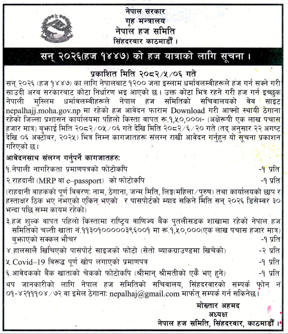 तस्बिर : सन् २०२६ (हज १४४७) को हज यात्राको लागि सूचना