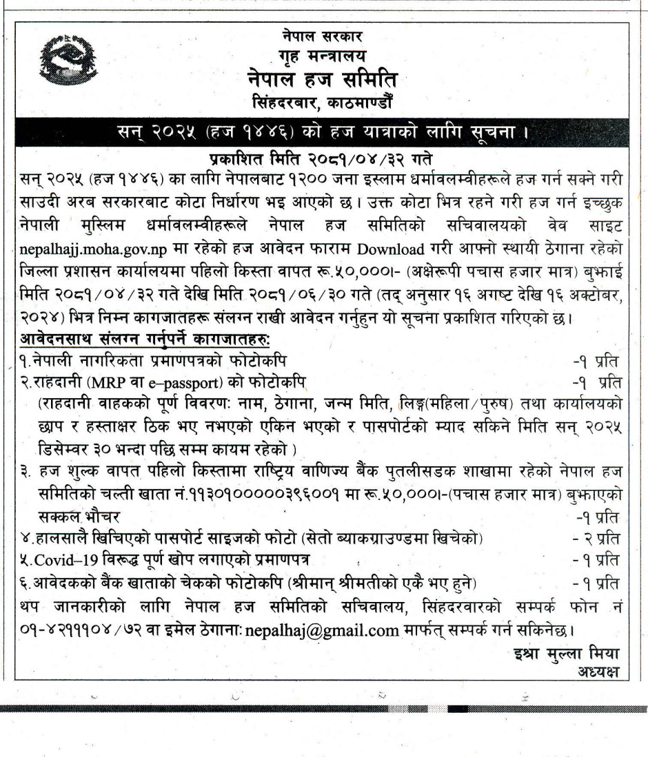 तस्बिर : सन् २०२५ (हज १४४६) को हज यात्राको लागि सूचना ।