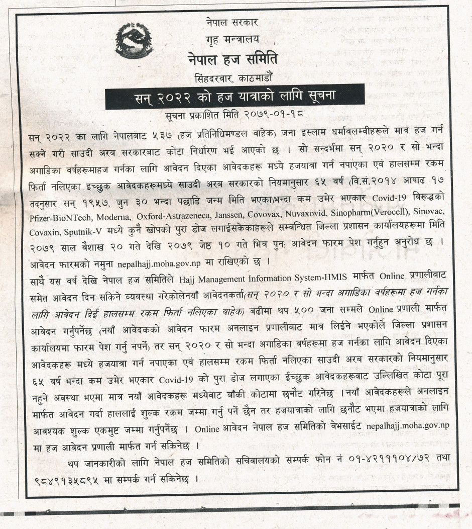 | सन् २०२२ को हज यात्राको लागि सूचना |