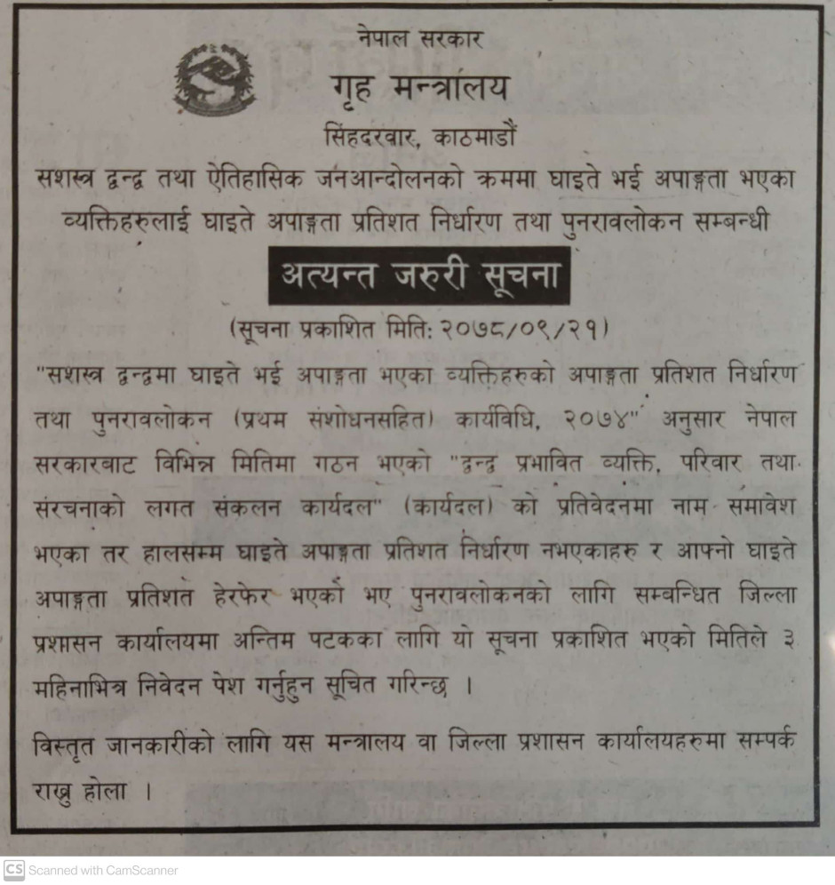 तस्बिर : सशस्त्र द्वन्द्व तथा ऐतिहासिक जनआन्दोलनको क्रममा घाइते भई अपाङ्गता भएका व्यक्तिहरुलाई घाइते अपाङ्गता प्रतिशत निर्धारण तथा पुनरावलोकन सम्बन्धी सूचना