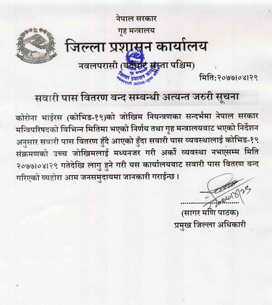 तस्बिर : सवारी पास वितरण बन्द सम्बन्धी अत्यन्त जरुरी सूचना
