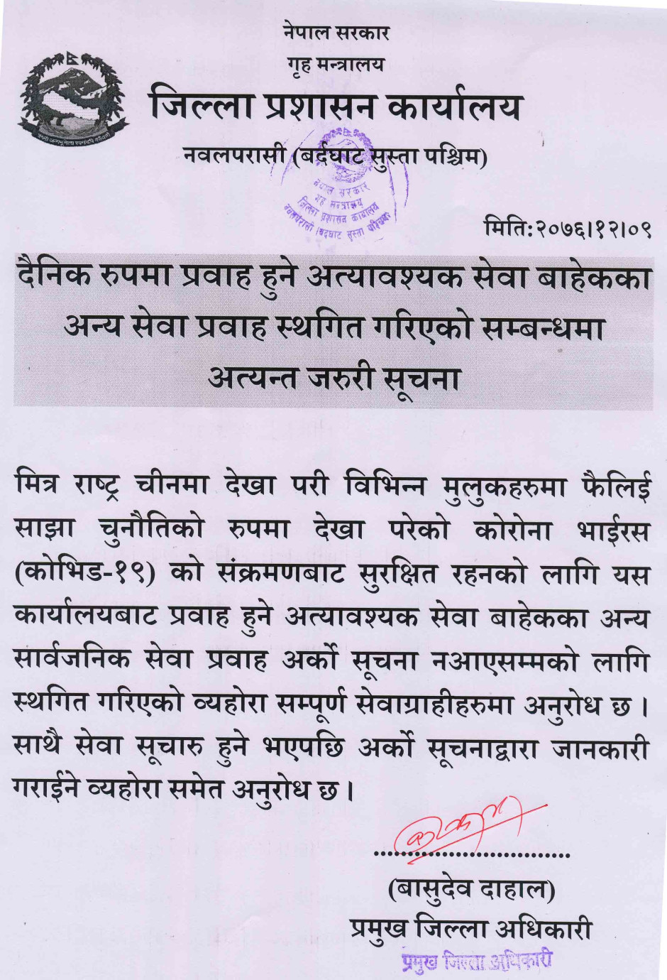 तस्बिर : दैनिक रुपमा प्रवाह हुने अत्यावश्यक सेवा बाहेकका अन्य सेवा प्रवाह स्थगित गरिएको सम्बन्धमा अत्यन्त जरुरी सूचना
