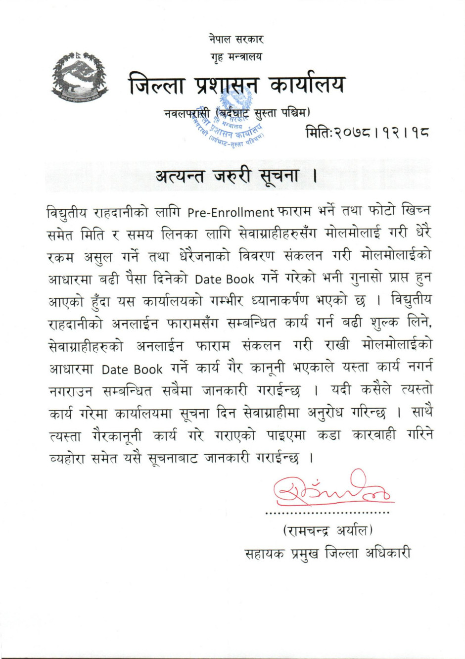 © सर्वाधिकार सुरक्षित जिल्ला प्रशासन कार्यालय, नवलपरासी (बर्दघाट सुस्ता पश्चिम) .